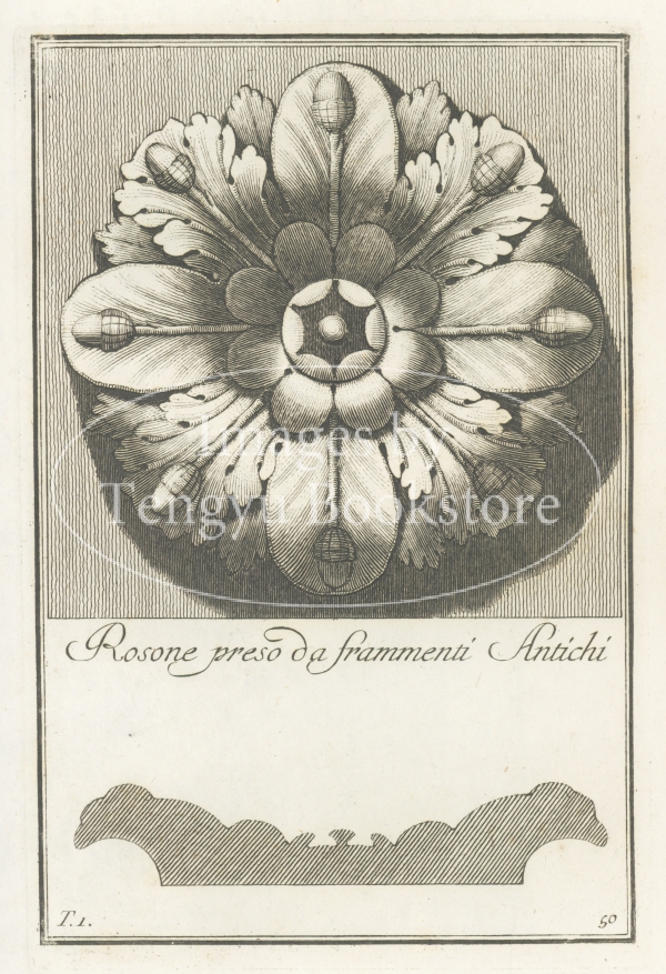 18世紀イタリアの建築家カルロ・アントニーニ(1740-1821)が、古代ローマの建築に用いられた花形の装飾文様「ロゼット」の様々なデザインを収集した装飾図案集中の1図。