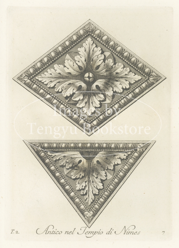 18世紀イタリアの建築家カルロ・アントニーニ(1740-1821)が、古代ローマの建築に用いられた花形の装飾文様「ロゼット」の様々なデザインを収集した装飾図案集中の1図。
