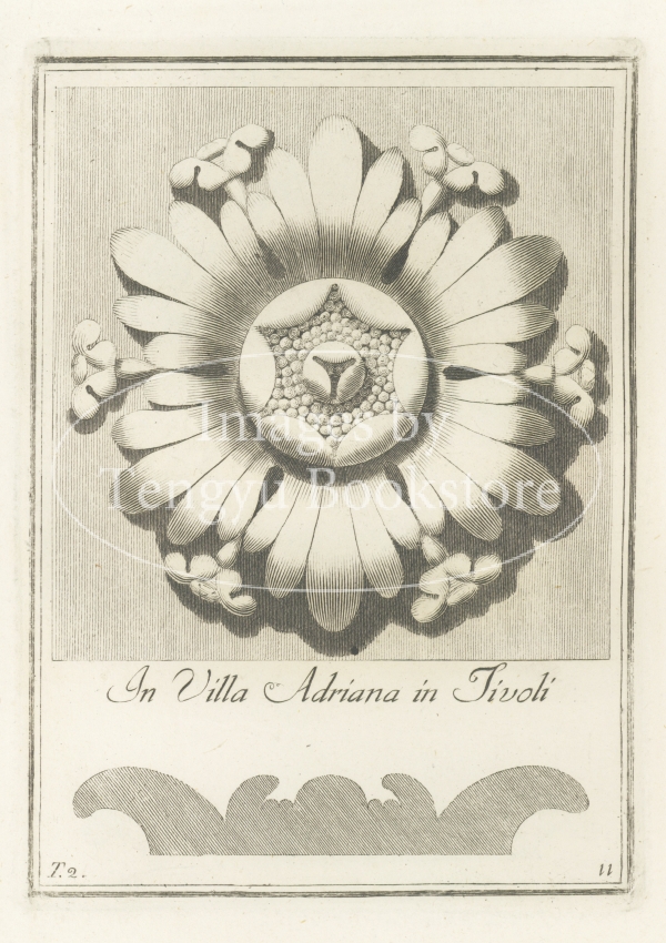 18世紀イタリアの建築家カルロ・アントニーニ(1740-1821)が、古代ローマの建築に用いられた花形の装飾文様「ロゼット」の様々なデザインを収集した装飾図案集中の1図。
