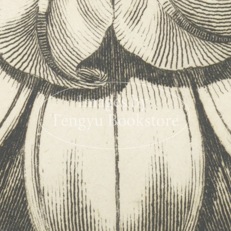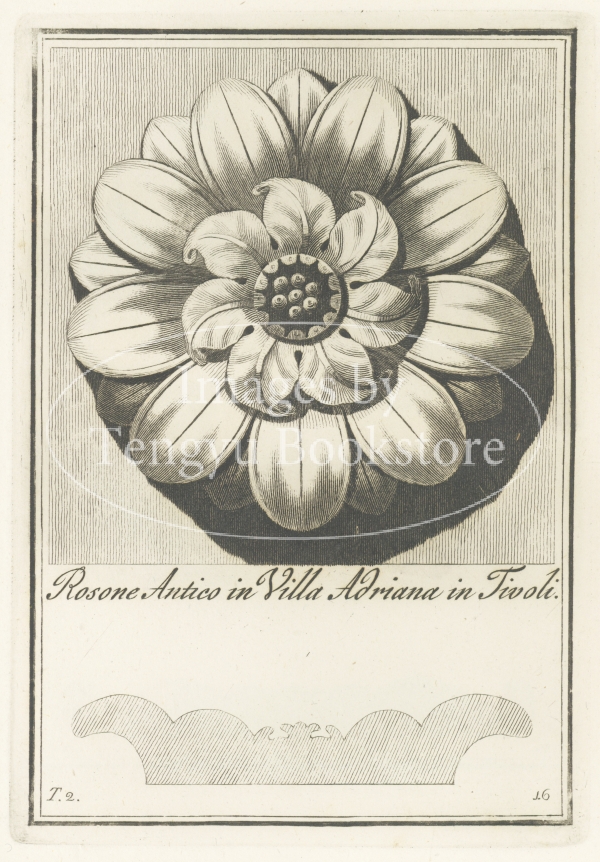 18世紀イタリアの建築家カルロ・アントニーニ(1740-1821)が、古代ローマの建築に用いられた花形の装飾文様「ロゼット」の様々なデザインを収集した装飾図案集中の1図。