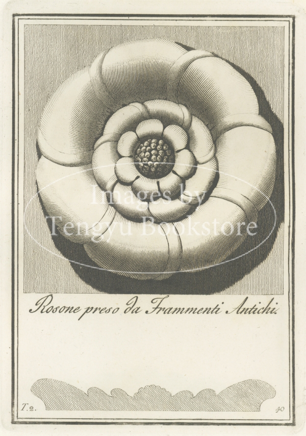 18世紀イタリアの建築家カルロ・アントニーニ(1740-1821)が、古代ローマの建築に用いられた花形の装飾文様「ロゼット」の様々なデザインを収集した装飾図案集中の1図。