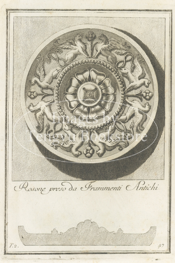 18世紀イタリアの建築家カルロ・アントニーニ(1740-1821)が、古代ローマの建築に用いられた花形の装飾文様「ロゼット」の様々なデザインを収集した装飾図案集中の1図。
