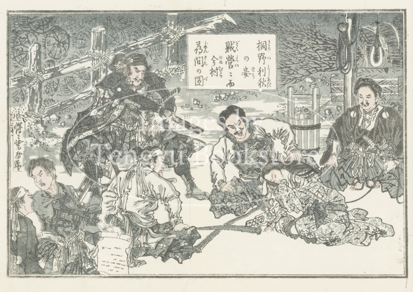 幕末・明治の浮世絵師 河鍋暁斎(1831-1889)が、明治10年(1877)に勃発した西郷隆盛を中心とする九州士族と明治政府との戦い「西南戦争」を題材に描いた木版画。