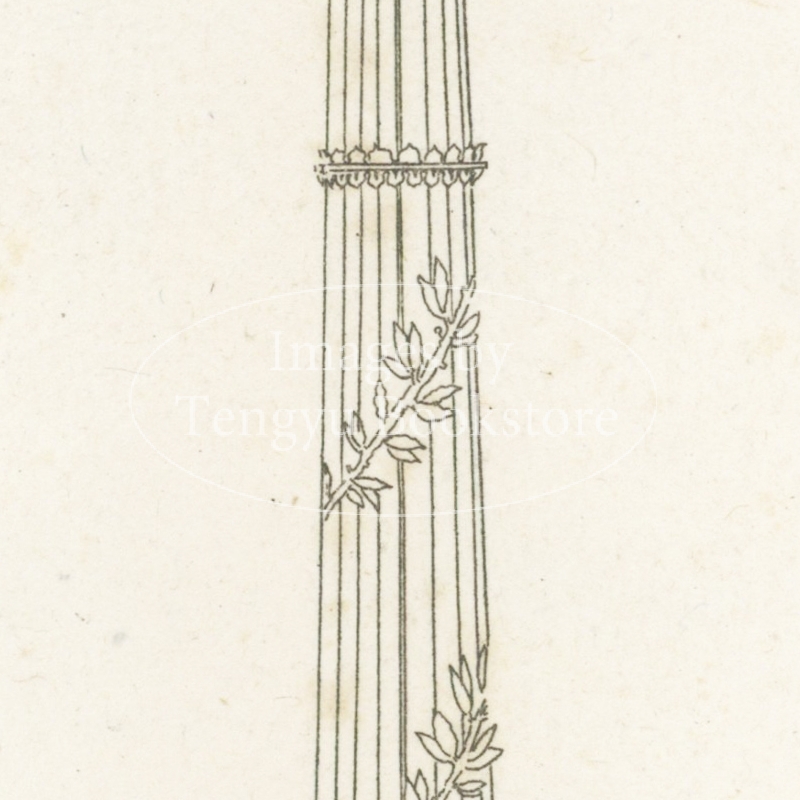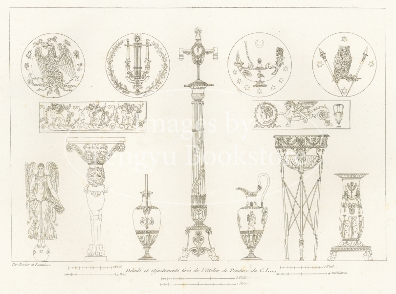 著者のシャルル・ペルシエ(1764-1838)とピエール・フランソワ・レオナール・フォンテーヌ(1762-1853)は、ナポレオンの妻ジョゼフィーヌが暮らしたマルメゾン城の改修工事や、パリの凱旋門の一つ「カルーゼル凱旋門」の建造を手掛けたことで知られる建築家。古代文明から影響を取り入れた壮麗なデザインが特徴の装飾様式「アンピール様式(帝政様式)」を確立したペルシエとフォンテーヌが銅版画を用いてアンピール様式によるインテリアデザインの全貌を紹介した貴重で美しい建築書です。