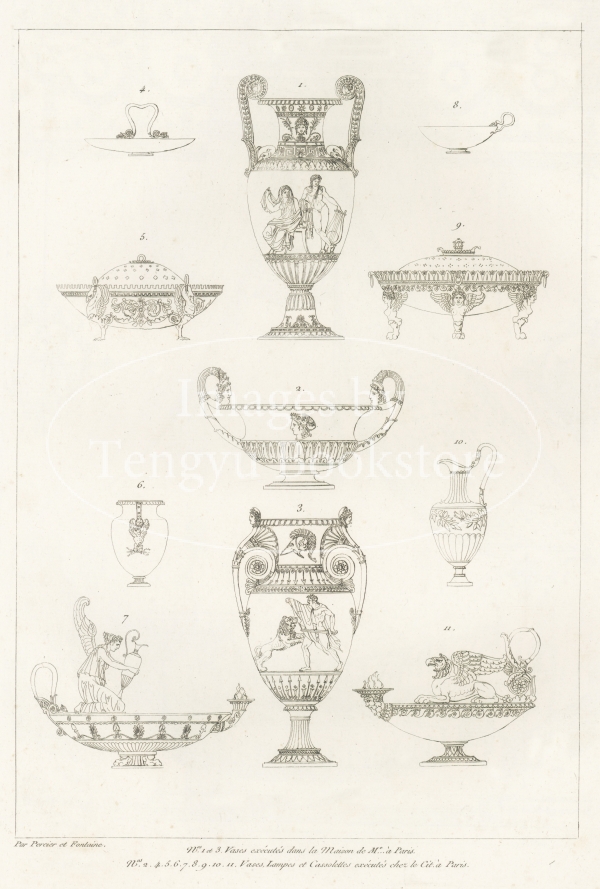 著者のシャルル・ペルシエ(1764-1838)とピエール・フランソワ・レオナール・フォンテーヌ(1762-1853)は、ナポレオンの妻ジョゼフィーヌが暮らしたマルメゾン城の改修工事や、パリの凱旋門の一つ「カルーゼル凱旋門」の建造を手掛けたことで知られる建築家。古代文明から影響を取り入れた壮麗なデザインが特徴の装飾様式「アンピール様式(帝政様式)」を確立したペルシエとフォンテーヌが銅版画を用いてアンピール様式によるインテリアデザインの全貌を紹介した貴重で美しい建築書です。