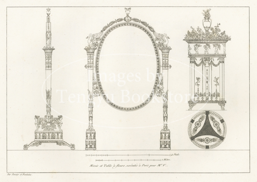 著者のシャルル・ペルシエ(1764-1838)とピエール・フランソワ・レオナール・フォンテーヌ(1762-1853)は、ナポレオンの妻ジョゼフィーヌが暮らしたマルメゾン城の改修工事や、パリの凱旋門の一つ「カルーゼル凱旋門」の建造を手掛けたことで知られる建築家。古代文明から影響を取り入れた壮麗なデザインが特徴の装飾様式「アンピール様式(帝政様式)」を確立したペルシエとフォンテーヌが銅版画を用いてアンピール様式によるインテリアデザインの全貌を紹介した貴重で美しい建築書です。