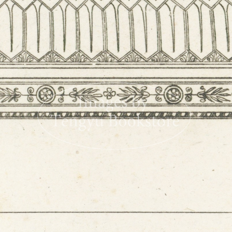 著者のシャルル・ペルシエ(1764-1838)とピエール・フランソワ・レオナール・フォンテーヌ(1762-1853)は、ナポレオンの妻ジョゼフィーヌが暮らしたマルメゾン城の改修工事や、パリの凱旋門の一つ「カルーゼル凱旋門」の建造を手掛けたことで知られる建築家。古代文明から影響を取り入れた壮麗なデザインが特徴の装飾様式「アンピール様式(帝政様式)」を確立したペルシエとフォンテーヌが銅版画を用いてアンピール様式によるインテリアデザインの全貌を紹介した貴重で美しい建築書です。