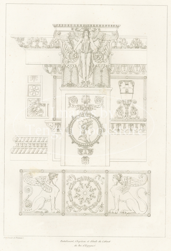 著者のシャルル・ペルシエ(1764-1838)とピエール・フランソワ・レオナール・フォンテーヌ(1762-1853)は、ナポレオンの妻ジョゼフィーヌが暮らしたマルメゾン城の改修工事や、パリの凱旋門の一つ「カルーゼル凱旋門」の建造を手掛けたことで知られる建築家。古代文明から影響を取り入れた壮麗なデザインが特徴の装飾様式「アンピール様式(帝政様式)」を確立したペルシエとフォンテーヌが銅版画を用いてアンピール様式によるインテリアデザインの全貌を紹介した貴重で美しい建築書です。