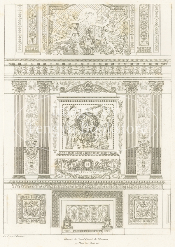 著者のシャルル・ペルシエ(1764-1838)とピエール・フランソワ・レオナール・フォンテーヌ(1762-1853)は、ナポレオンの妻ジョゼフィーヌが暮らしたマルメゾン城の改修工事や、パリの凱旋門の一つ「カルーゼル凱旋門」の建造を手掛けたことで知られる建築家。古代文明から影響を取り入れた壮麗なデザインが特徴の装飾様式「アンピール様式(帝政様式)」を確立したペルシエとフォンテーヌが銅版画を用いてアンピール様式によるインテリアデザインの全貌を紹介した貴重で美しい建築書です。