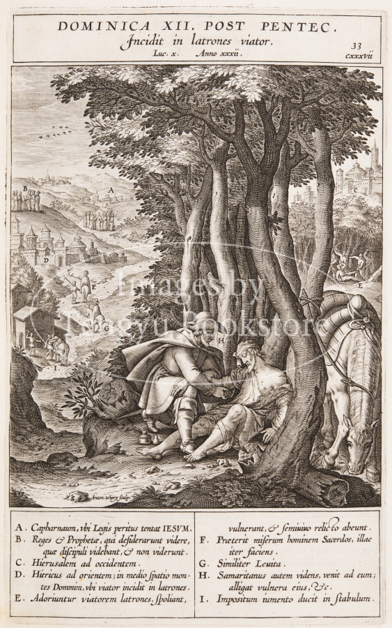 イエス・キリストの生涯の記録である福音書に、スペインの宣教師ヘロニモ・ナダル(1507-1580)が註釈をほどこし、153点におよぶ銅版画によって図解した本書は、信者の信仰心をより深め布教にも役立つ視覚に訴える聖書として作られたもの。