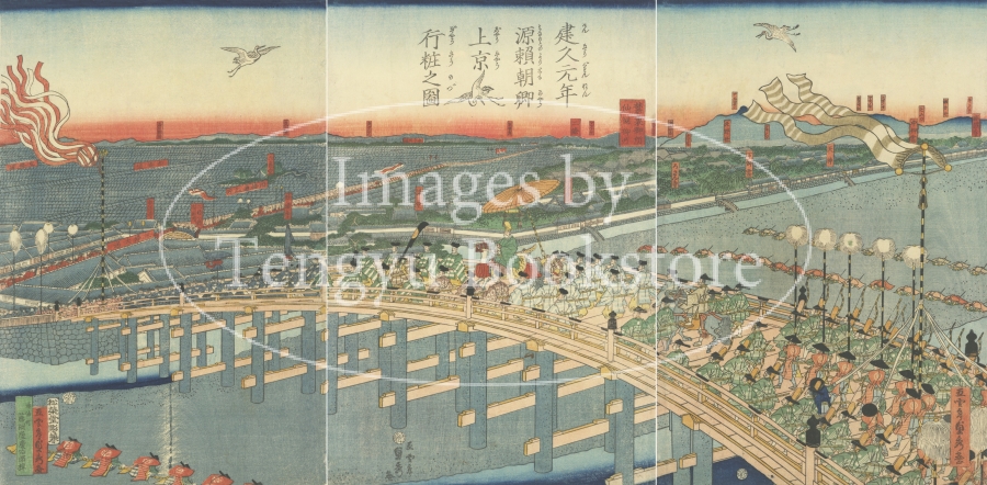幕末・明治時代の浮世絵師 五雲亭貞秀(ごうんていさだひで:1807-1879)による3枚続浮世絵「建久元年源頼朝卿上京行粧之図」。奥州合戦が終息した翌年、鎌倉から源頼朝が上洛する際の様子が描かれています。