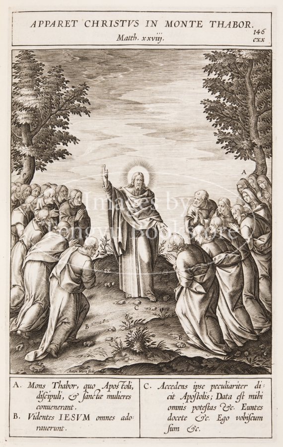 イエス・キリストの生涯の記録である福音書に、スペインの宣教師ヘロニモ・ナダル(1507-1580)が註釈をほどこし、153点におよぶ銅版画によって図解した本書は、信者の信仰心をより深め布教にも役立つ視覚に訴える聖書として作られたもの。