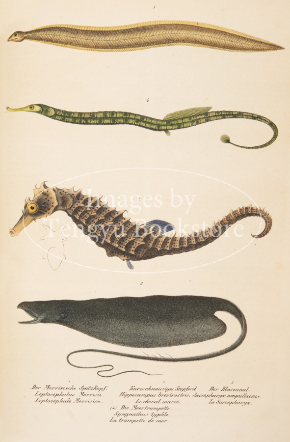 1836年に刊行された本書は、97点もの美しい手彩色石版図版を用いて、世界の魚類を広く紹介したもの。