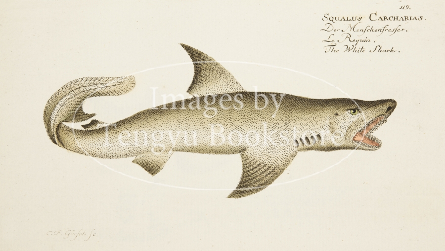 魚類学者マルクス・エリエゼル・ブロッホ(1723-1799)が著した本書は、18世紀当時知られていた世界の魚の図版をおよそ200点収録したもの。従来は地面に横たえた状態で描かれていた魚の絵から背景を省略し魚のみを精密に描写した本書の図版は、その後の図鑑表現の原点ともなった歴史的に重要な作品です。