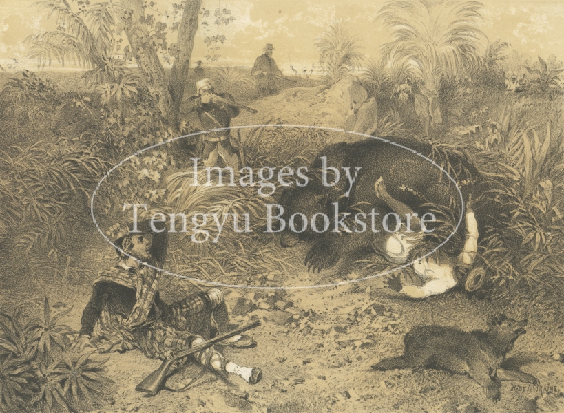 「ライオン殺し」の異名をもつ19世紀フランスの軍人、探検家ジュール・ジェラール(1817-1864)によるアフリカ狩猟紀行の記録「アフリカの狩り」収録の挿絵。