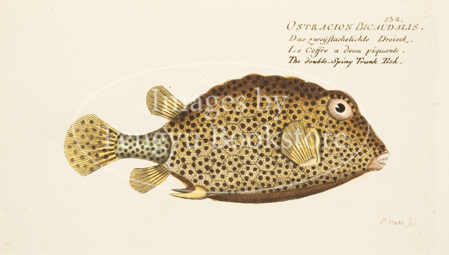 魚類学者マルクス・エリエゼル・ブロッホ(1723-1799)が著した本書は、18世紀当時知られていた世界の魚の図版をおよそ200点収録したもの。従来は地面に横たえた状態で描かれていた魚の絵から背景を省略し魚のみを精密に描写した本書の図版は、その後の図鑑表現の原点ともなった歴史的に重要な作品です。