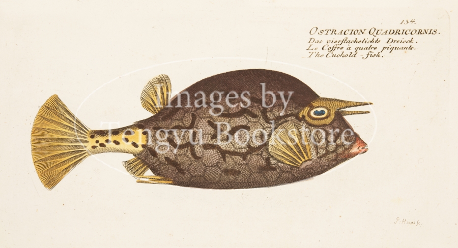 魚類学者マルクス・エリエゼル・ブロッホ(1723-1799)が著した本書は、18世紀当時知られていた世界の魚の図版をおよそ200点収録したもの。従来は地面に横たえた状態で描かれていた魚の絵から背景を省略し魚のみを精密に描写した本書の図版は、その後の図鑑表現の原点ともなった歴史的に重要な作品です。