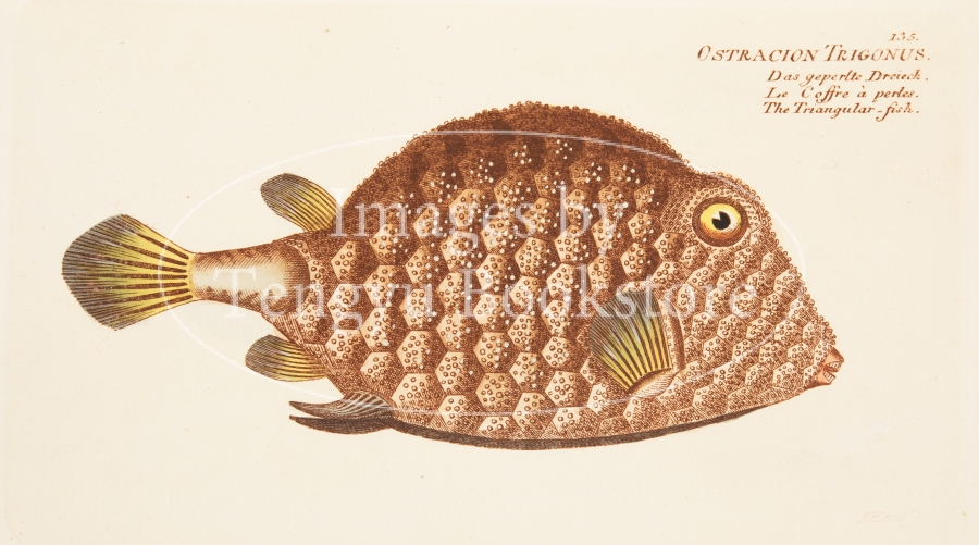 魚類学者マルクス・エリエゼル・ブロッホ(1723-1799)が著した本書は、18世紀当時知られていた世界の魚の図版をおよそ200点収録したもの。従来は地面に横たえた状態で描かれていた魚の絵から背景を省略し魚のみを精密に描写した本書の図版は、その後の図鑑表現の原点ともなった歴史的に重要な作品です。