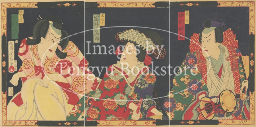 幕末から明治にかけての浮世絵師 歌川房種(生没年不詳)による三枚続の役者絵。