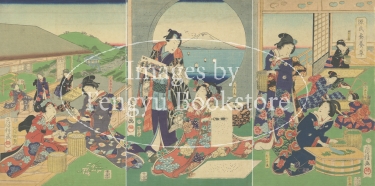 幕末から明治にかけての浮世絵師 歌川房種(生没年不詳)による養蚕をモチーフにした三枚続の浮世絵。