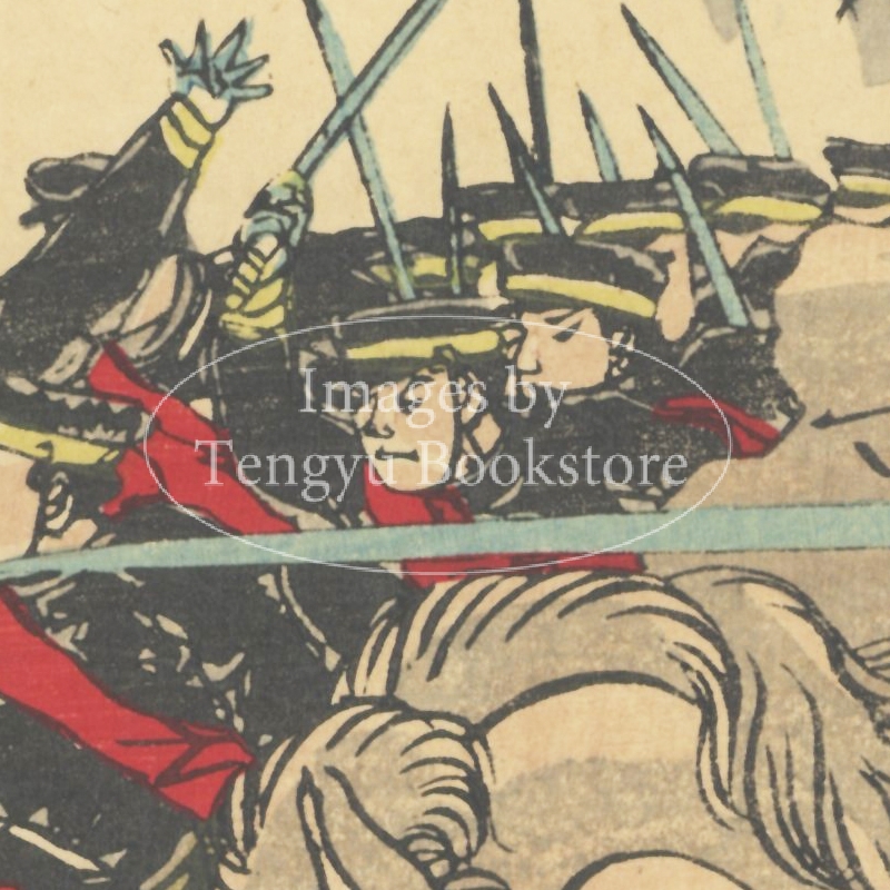 明治時代に活躍した浮世絵師 三代 国輝(生没年不詳) による、日清戦争を題材とした三枚続の浮世絵。