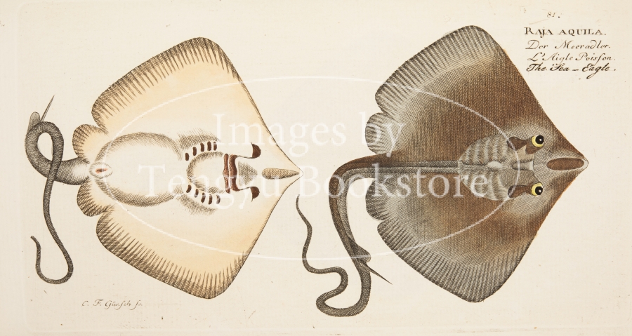 魚類学者マルクス・エリエゼル・ブロッホ(1723-1799)が著した本書は、18世紀当時知られていた世界の魚の図版をおよそ200点収録したもの。従来は地面に横たえた状態で描かれていた魚の絵から背景を省略し魚のみを精密に描写した本書の図版は、その後の図鑑表現の原点ともなった歴史的に重要な作品です。