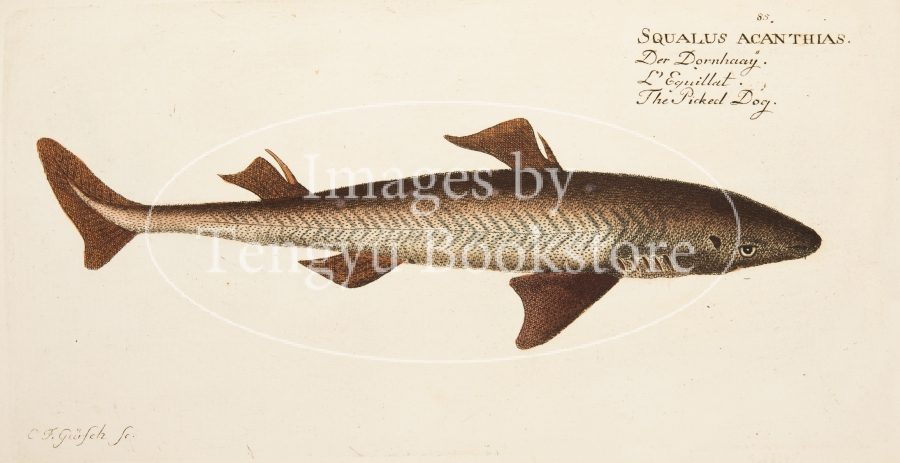 魚類学者マルクス・エリエゼル・ブロッホ(1723-1799)が著した本書は、18世紀当時知られていた世界の魚の図版をおよそ200点収録したもの。従来は地面に横たえた状態で描かれていた魚の絵から背景を省略し魚のみを精密に描写した本書の図版は、その後の図鑑表現の原点ともなった歴史的に重要な作品です。
