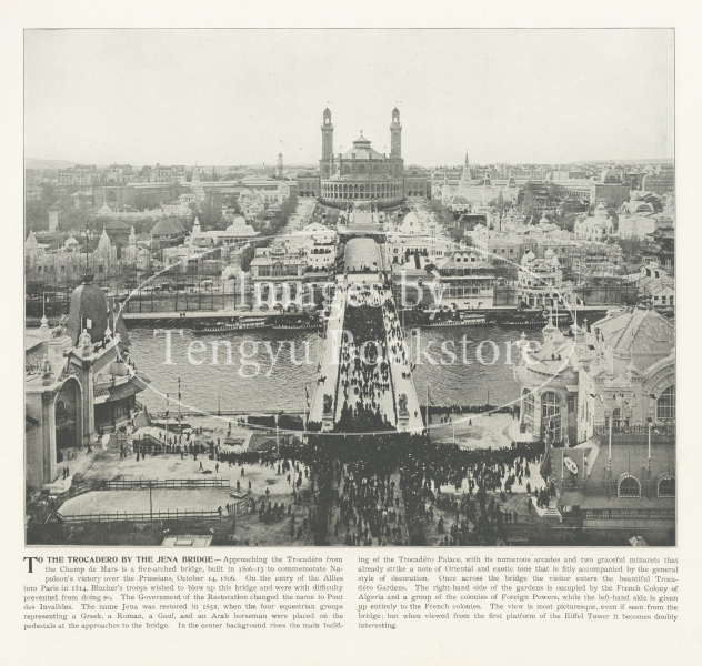 1889年に建造されたエッフェル塔を取り巻く様々なパヴィリオンや施設、出品展示品等、当時のフランスが国力の粋を尽くした一大イベントの全容を記録した興味深い資料です。