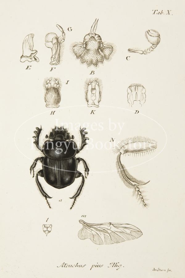 18-19世紀ドイツの博物学者ヤーコブ・シュトルム(1771-1848)の主著「ドイツ動物誌」中の昆虫編の一図。細密な手彩色銅版図をもちいて、ドイツに生息する昆虫を紹介したドイツ博物学書の名作。