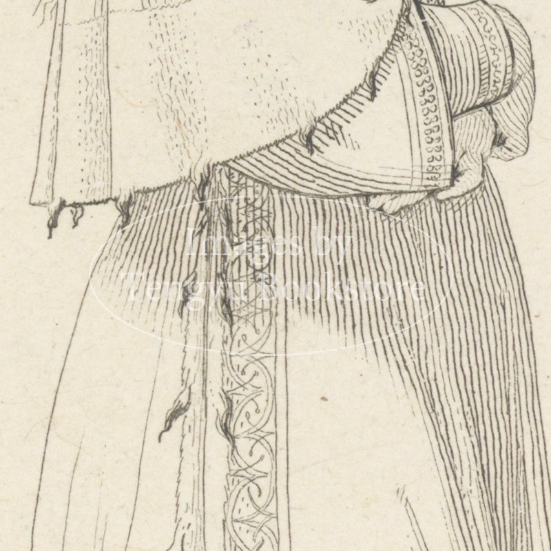 19世紀フランスで刊行された中世~ルネサンス期イタリアの服飾図集「13,14,15世紀の服飾」の1図。本書は中世~ルネサンス期イタリアの絵画や彫刻から抜粋した服飾の図版に解説を加えた西洋服飾史書の古典。
