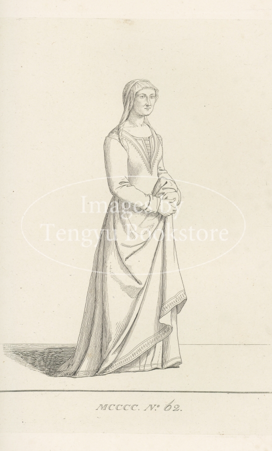 19世紀フランスで刊行された中世~ルネサンス期イタリアの服飾図集「13,14,15世紀の服飾」の1図。本書は中世~ルネサンス期イタリアの絵画や彫刻から抜粋した服飾の図版に解説を加えた西洋服飾史書の古典。