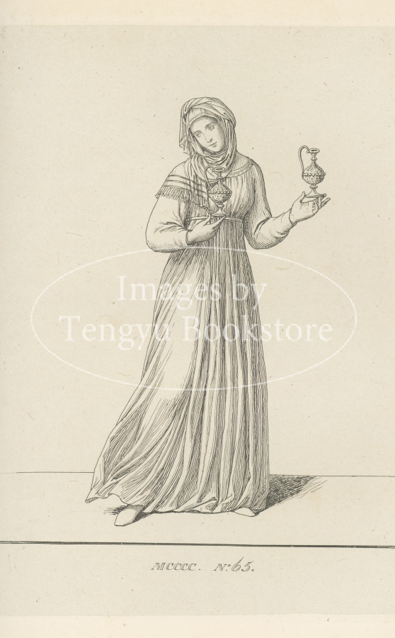 19世紀フランスで刊行された中世~ルネサンス期イタリアの服飾図集「13,14,15世紀の服飾」の1図。本書は中世~ルネサンス期イタリアの絵画や彫刻から抜粋した服飾の図版に解説を加えた西洋服飾史書の古典。
