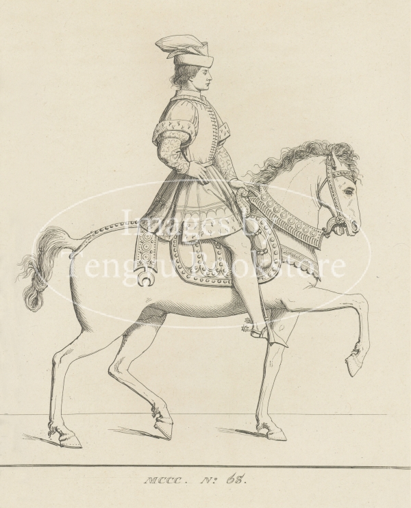 19世紀フランスで刊行された中世~ルネサンス期イタリアの服飾図集「13,14,15世紀の服飾」の1図。本書は中世~ルネサンス期イタリアの絵画や彫刻から抜粋した服飾の図版に解説を加えた西洋服飾史書の古典。