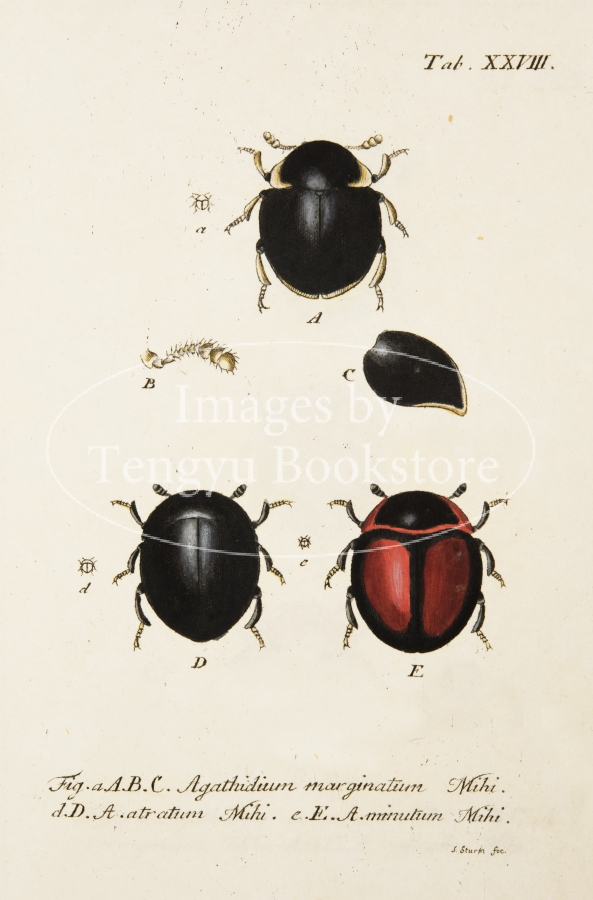 18-19世紀ドイツの博物学者ヤーコブ・シュトルム(1771-1848)の主著「ドイツ動物誌」中の昆虫編の一図。細密な手彩色銅版図をもちいて、ドイツに生息する昆虫を紹介したドイツ博物学書の名作。
