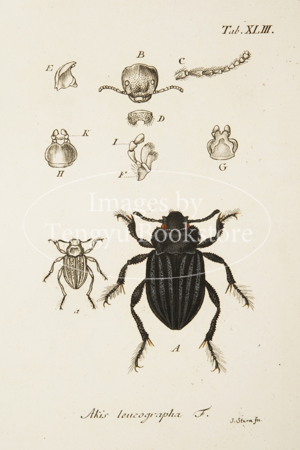 18-19世紀ドイツの博物学者ヤーコブ・シュトルム(1771-1848)の主著「ドイツ動物誌」中の昆虫編の一図。細密な手彩色銅版図をもちいて、ドイツに生息する昆虫を紹介したドイツ博物学書の名作。