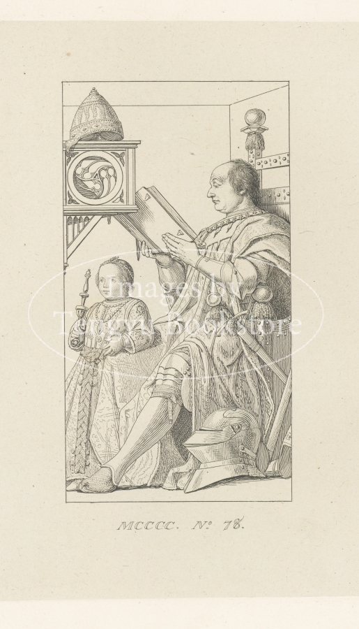19世紀フランスで刊行された中世~ルネサンス期イタリアの服飾図集「13,14,15世紀の服飾」の1図。本書は中世~ルネサンス期イタリアの絵画や彫刻から抜粋した服飾の図版に解説を加えた西洋服飾史書の古典。