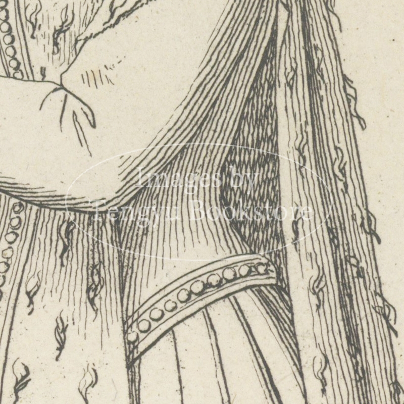 19世紀フランスで刊行された中世~ルネサンス期イタリアの服飾図集「13,14,15世紀の服飾」の1図。本書は中世~ルネサンス期イタリアの絵画や彫刻から抜粋した服飾の図版に解説を加えた西洋服飾史書の古典。