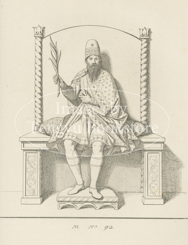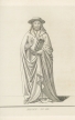 19世紀フランスで刊行された中世~ルネサンス期イタリアの服飾図集「13,14,15世紀の服飾」の1図。本書は中世~ルネサンス期イタリアの絵画や彫刻から抜粋した服飾の図版に解説を加えた西洋服飾史書の古典。