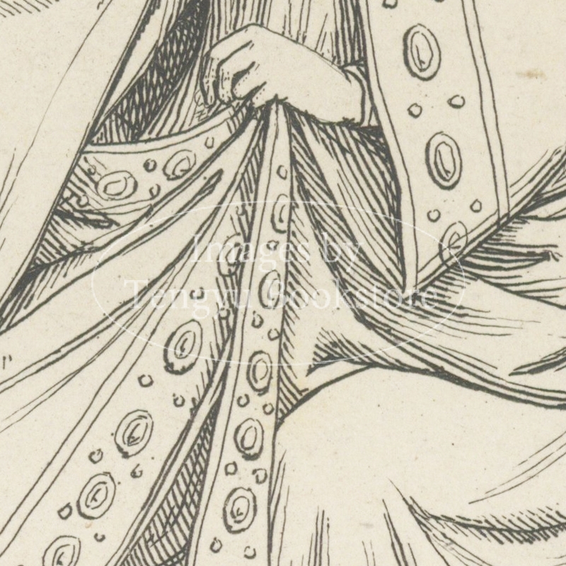 19世紀フランスで刊行された中世~ルネサンス期イタリアの服飾図集「13,14,15世紀の服飾」の1図。本書は中世~ルネサンス期イタリアの絵画や彫刻から抜粋した服飾の図版に解説を加えた西洋服飾史書の古典。