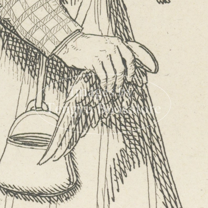 19世紀フランスで刊行された中世~ルネサンス期イタリアの服飾図集「13,14,15世紀の服飾」の1図。本書は中世~ルネサンス期イタリアの絵画や彫刻から抜粋した服飾の図版に解説を加えた西洋服飾史書の古典。