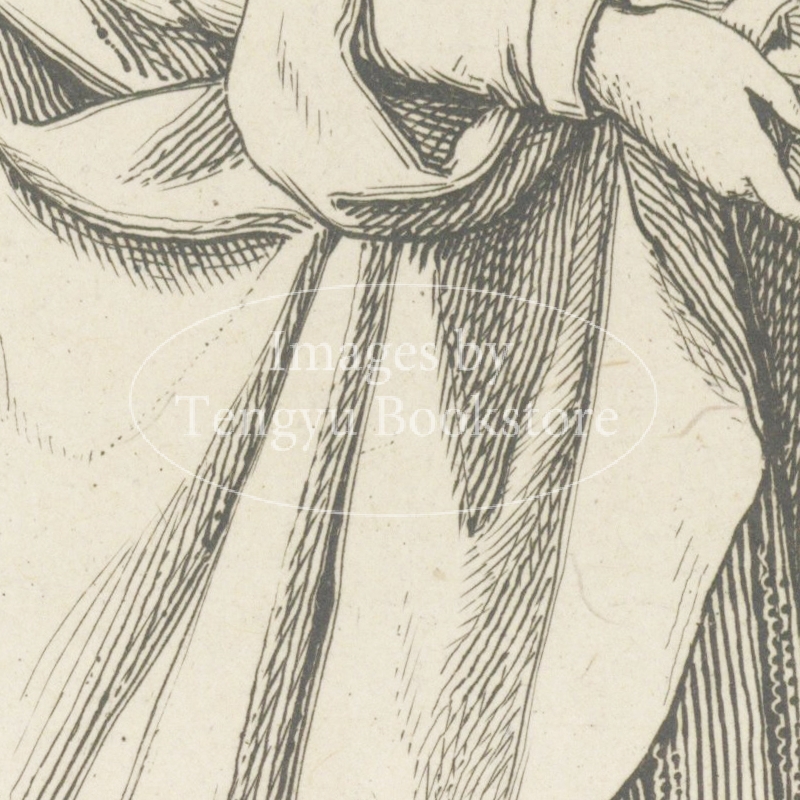 19世紀フランスで刊行された中世~ルネサンス期イタリアの服飾図集「13,14,15世紀の服飾」の1図。本書は中世~ルネサンス期イタリアの絵画や彫刻から抜粋した服飾の図版に解説を加えた西洋服飾史書の古典。