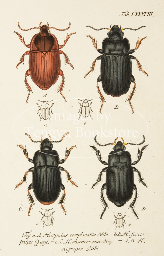 18-19世紀ドイツの博物学者ヤーコブ・シュトルム(1771-1848)の主著「ドイツ動物誌」中の昆虫編の一図。細密な手彩色銅版図をもちいて、ドイツに生息する昆虫を紹介したドイツ博物学書の名作。