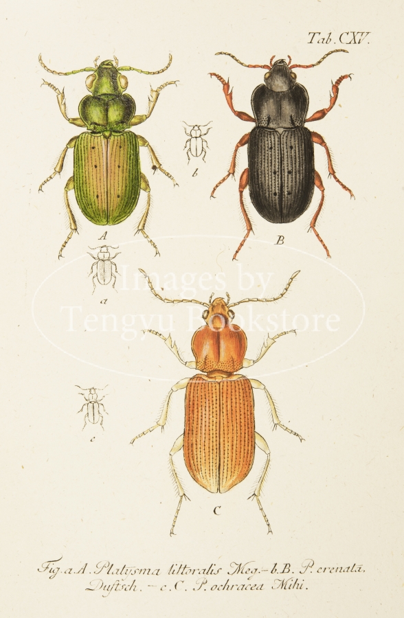 18-19世紀ドイツの博物学者ヤーコブ・シュトルム(1771-1848)の主著「ドイツ動物誌」中の昆虫編の一図。細密な手彩色銅版図をもちいて、ドイツに生息する昆虫を紹介したドイツ博物学書の名作。