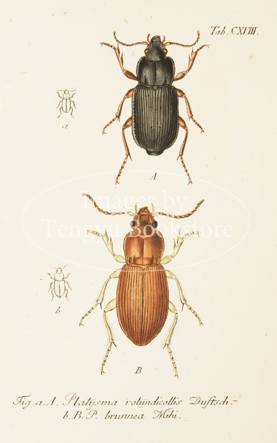 18-19世紀ドイツの博物学者ヤーコブ・シュトルム(1771-1848)の主著「ドイツ動物誌」中の昆虫編の一図。細密な手彩色銅版図をもちいて、ドイツに生息する昆虫を紹介したドイツ博物学書の名作。