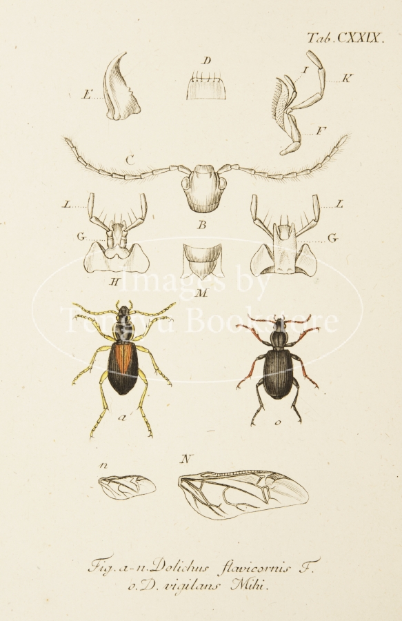 18-19世紀ドイツの博物学者ヤーコブ・シュトルム(1771-1848)の主著「ドイツ動物誌」中の昆虫編の一図。細密な手彩色銅版図をもちいて、ドイツに生息する昆虫を紹介したドイツ博物学書の名作。
