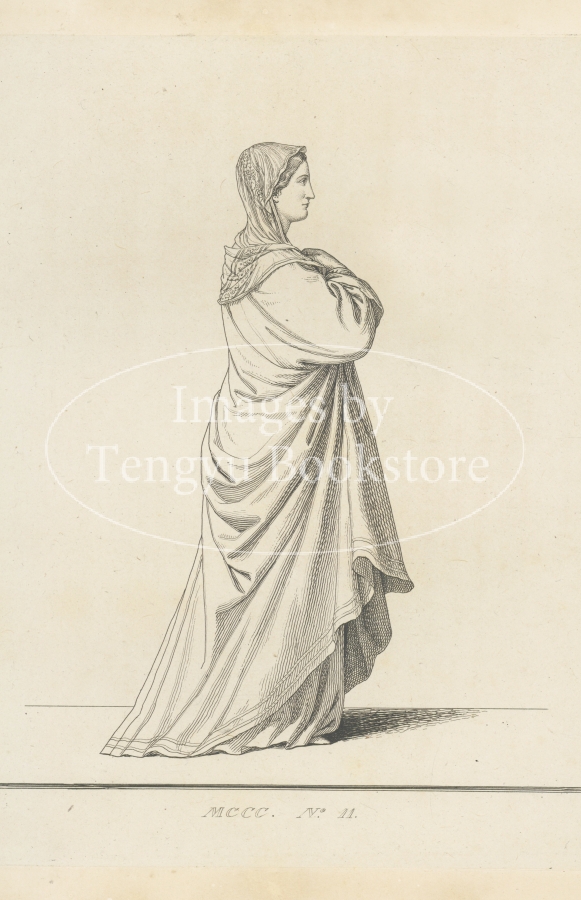 19世紀フランスで刊行された中世~ルネサンス期イタリアの服飾図集「13,14,15世紀の服飾」の1図。本書は中世~ルネサンス期イタリアの絵画や彫刻から抜粋した服飾の図版に解説を加えた西洋服飾史書の古典。