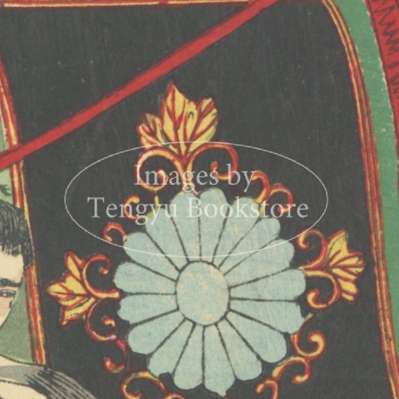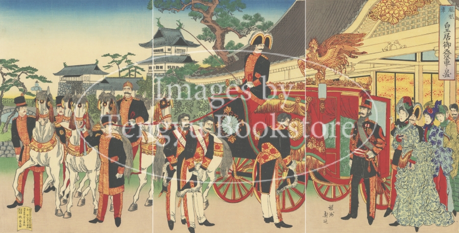 江戸末期~明治の浮世絵師 楊洲周延(ようしゅうちかのぶ:1838-1912)による三枚続の浮世絵。憲法発布式の後、青山練兵場に向かうために皇居を出発する天皇一行が描かれています。
