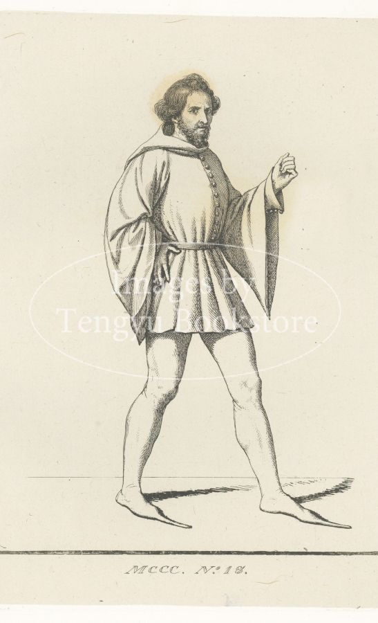 19世紀フランスで刊行された中世~ルネサンス期イタリアの服飾図集「13,14,15世紀の服飾」の1図。本書は中世~ルネサンス期イタリアの絵画や彫刻から抜粋した服飾の図版に解説を加えた西洋服飾史書の古典。
