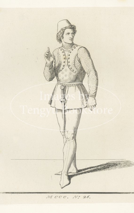 19世紀フランスで刊行された中世~ルネサンス期イタリアの服飾図集「13,14,15世紀の服飾」の1図。本書は中世~ルネサンス期イタリアの絵画や彫刻から抜粋した服飾の図版に解説を加えた西洋服飾史書の古典。