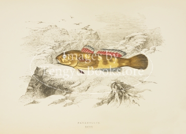 19世紀イギリスの博物学者ジョナサン・クーチ(1789–1870)の主著「ブリテン諸島魚類誌」の挿絵。グレート・ブリテン島やアイルランド島をはじめ、大小様々な島で構成されたブリテン諸島に生息する魚類を精緻な色刷木口木版画で表現した博物図鑑の名作です。